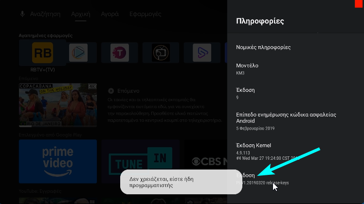 Αν δεν το έχουμε κάνει ήδη, από τις Ρυθμίσεις του TV Box > Προτιμήσεις συσκευής > Πληροφορίες > πατάμε επτά φορές στην Έκδοση στο κάτω τμήμα.