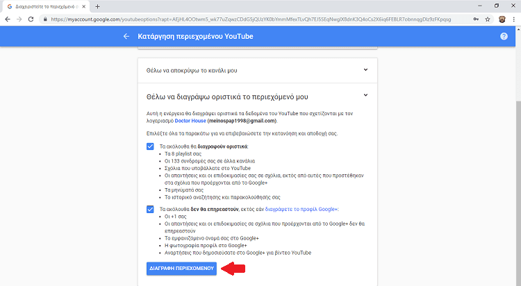 Εδώ, πατάμε το «Θέλω να διαγράψω οριστικά το περιεχόμενό μου», ώστε ν' ανοίξει το πλαίσιο με τις επιλογές.