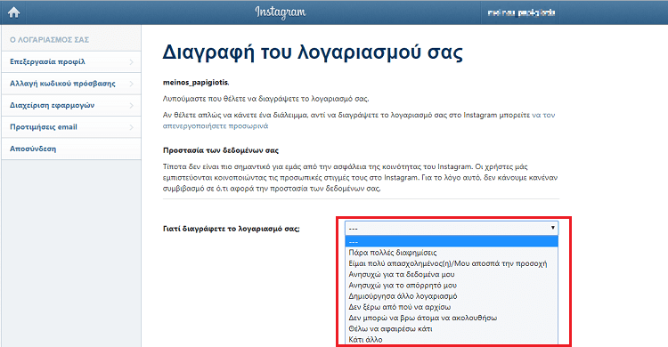 H διαγραφή του λογαριασμού ήταν και αυτή μια εύκολη διαδικασία, η οποία γινόταν μέσα από τις ρυθμίσεις της εφαρμογής. Όμως αυτό άλλαξε, όταν το Facebook εξαγόρασε το Instagram.