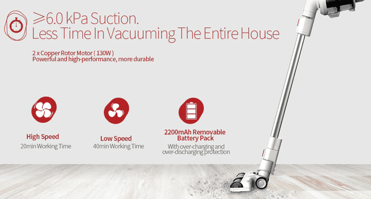 Για τον καθαρισμό διαθέτει δύο ταχύτητες λειτουργίας: χαμηλή και υψηλή. Χρησιμοποιώντας τη χαμηλή ταχύτητα, ο χρόνος χρήσης της σκούπας ανέρχεται στα 40 λεπτά.