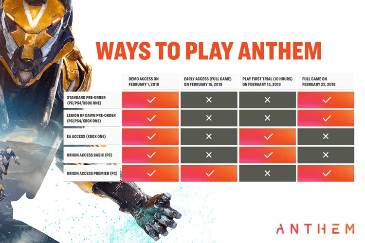 Στον πίνακα αναφέρεται ότι στις 15 Φεβρουαρίου θα αποκτήσουν πρόσβαση στο Anthem όσοι διατηρούν συνδρομή Origin Access ή EA Access. Όσοι έχουν προπαραγγείλει το παιχνίδι, θα πρέπει να περιμένουν μέχρι της 22 Φεβρουαρίου, όπως όλοι οι υπόλοιποι παίκτες.