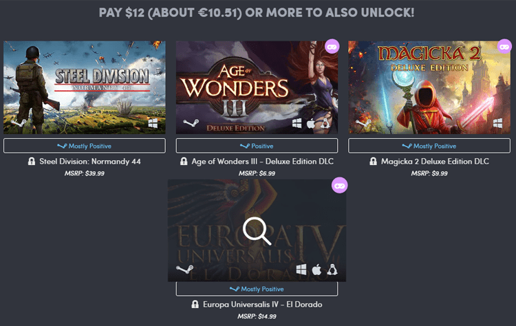 Πληρώνοντας περίπου ένα ευρώ, παίρνουμε το “Age of Wonders II: The Wizard's Throne”, το “Darkest Hour: A Hearts of Iron Game”, το “Magicka 2”, και το “Crusader Kings II”.