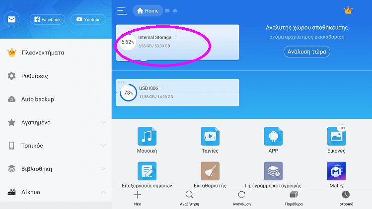 Στη συνέχεια, πηγαίνουμε πίσω στην αρχική καρτέλα του ES. Πατάμε στο “Internal Storage”…