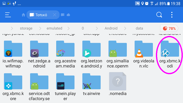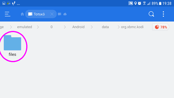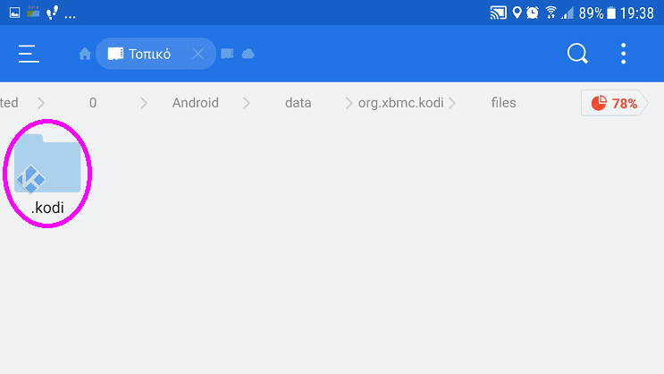 Εδώ πρέπει να προσέξουμε ότι στο Android αυτός ο φάκελος του Kodi είναι κρυφός. Για να εμφανιστεί, πρέπει να έχουμε ήδη εγκαταστήσει ένα σχετικό app που ενεργοποιεί τα κρυφά στοιχεία, όπως είναι ο ES File Explorer.