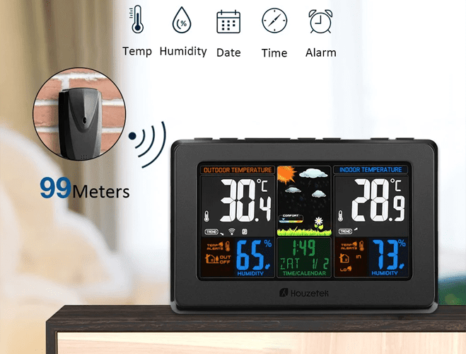 Ο σταθμός καιρού Houzetek Wireless Automatic Color Weather Station προβάλλει την αναλυτική πρόγνωση του καιρού, την ώρα, έχει λειτουργία ξυπνητηριού, και διαθέτει αισθητήρα καταγραφής της θερμοκρασίας και της υγρασίας εκτός του σπιτιού.