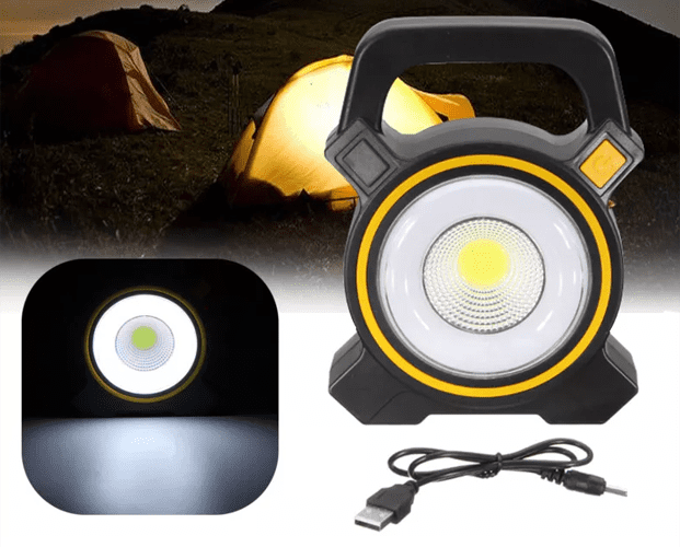 Η ηλιακή COB LED λάμπα της φωτογραφίας είναι φτιαγμένη από πλαστικό και έχει ισχύ 30W. Επίσης, έχει ρυθμιζόμενη ένταση φωτός έως 2400 lumen, φορτίζει μέσω USB ή από τους ηλιακούς συλλέκτες που διαθέτει, και μπορεί να λειτουργεί έως και 10 ώρες.