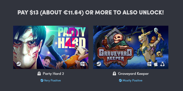 Mε 11,64€ και πάνω, προσθέτουμε στη συλλογή μας όλα τα παραπάνω παιχνίδια, μαζί με το “Party Hard 2” και το “Graveyard Keeper”. Η πραγματική αξία όλων των τίτλων μαζί είναι 164$.