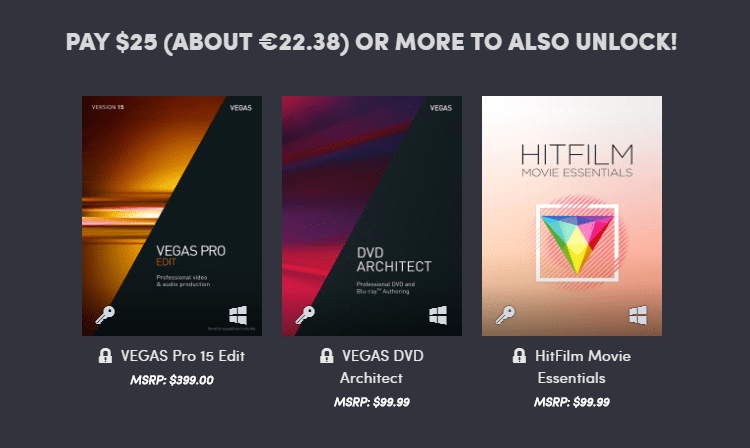 Τέλος, αν δώσουμε πάνω από 22,38€ στο πακέτο, προστίθενται το “VEGAS Pro 15 Edit”, το “VEGAS DVD Architect”, και το “HitFilm Movie Essentials”.