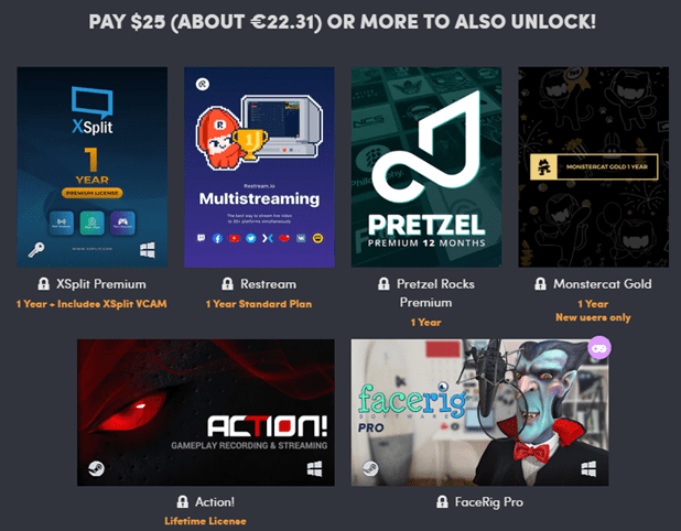 Τέλος, αν δώσουμε πάνω από 22,21€ στο πακέτο, προστίθενται το “FaceRig Pro”, εφ’ όρου ζωής άδεια για το “Action!”, και έναν χρόνο συνδρομή για τα “Restream”, “Monstercat Gold”, “Pretzel Rocks Premium”, και “XSplit Premium”.