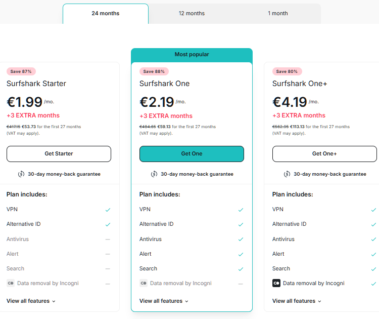 - One: Όλα τα χαρακτηριστικά του Starter, συν έξτρα λειτουργίες ασφαλείας μαζί με το Surfshark Antivirus. Το οικονομικότερο πακέτο είναι το 24μηνο με €2,19 μηνιαίως, συν τρεις έξτρα μήνες δωρεάν.