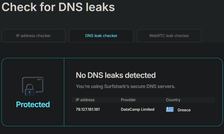 Ευτυχώς, όμως, ισχυρά VPN με καινοτόμες τεχνολογίες, όπως το Surfshark, μας καλύπτουν πλήρως από αυτές τις πολύ σοβαρές διαρροές κατά τη διάρκεια του streaming, όπως παρατηρούμε στα κάτωθι στιγμιότυπα. Είναι από εκτεταμένες δοκιμές που έχουμε κάνει στο PCsteps για το Surfshark, και πολλά άλλα VPN..