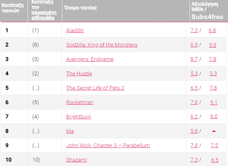 Έτσι λοιπόν, η πρώτη στήλη του πίνακα αριστερά δείχνει σε αύξουσα σειρά το έργο με τις περισσότερες λήψεις. Η δεύτερη μας δείχνει την κατάταξη που είχε η ταινία την προηγούμενη εβδομάδα.