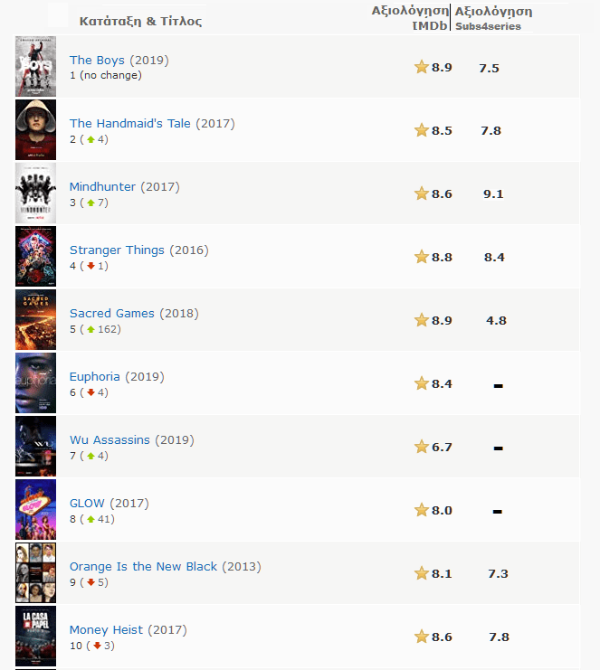 Η τελευταία στήλη δεξιά δείχνει πρώτα τη βαθμολογία από το δημοφιλές IMDb με τις χιλιάδες ψήφους. Ακριβώς δίπλα βλέπουμε τη βαθμολογία στο Subs4Free μόνο από Έλληνες χρήστες.