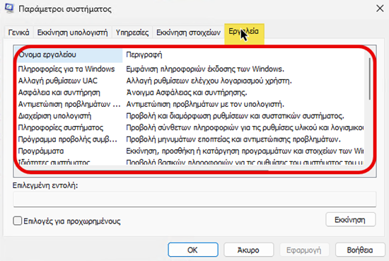 Τέλος, από την καρτέλα Εργαλεία μπορούμε να αποκτήσουμε πρόσβαση σε διάφορα χρήσιμα βοηθήματα που μεταξύ άλλων παρέχουν πληροφορίες και ρυθμίσεις για το σύστημα μας.