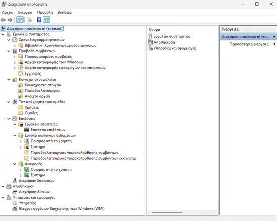 Μέσα από αυτό το εργαλείο μπορούμε να έχουμε πρόσβαση στη Διαχείριση Δίσκων για δημιουργία ή διαμόρφωση των δίσκων μας, στη Διαχείριση Συσκευών για ενημέρωση ή έλεγχο οδηγών συσκευών, καθώς και στην Προβολή συμβάντων για την επίβλεψη σφαλμάτων και συμβάντων του συστήματος.