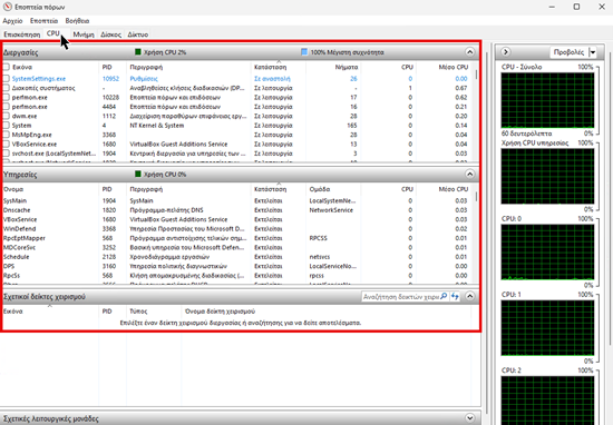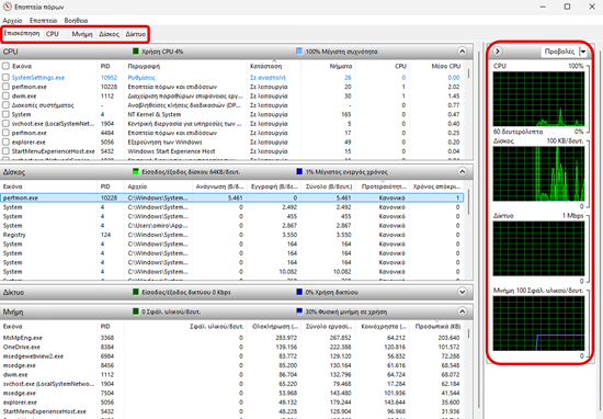 Με αναλυτικά γραφήματα και τους ταξινομημένους πίνακες, μπορούμε εύκολα να εντοπίσουμε ποιες διεργασίες ή εφαρμογές επιβαρύνουν το σύστημά μας και να λάβουμε τα κατάλληλα μέτρα για βελτίωση της απόδοσης των Windows.