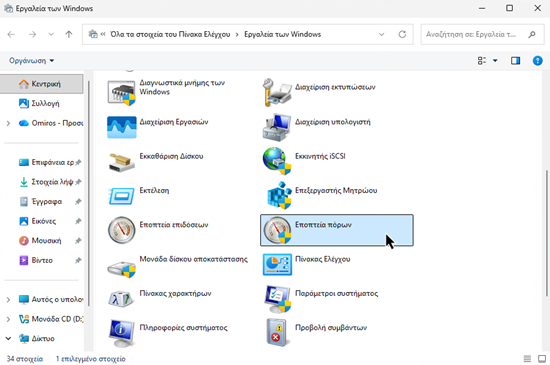 Την Εποπτεία Πόρων των Windows μπορούμε να τη βρούμε μέσα από την μπάρα αναζήτησης των Windows, ή στον πίνακα ελέγχου.