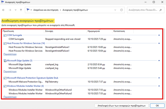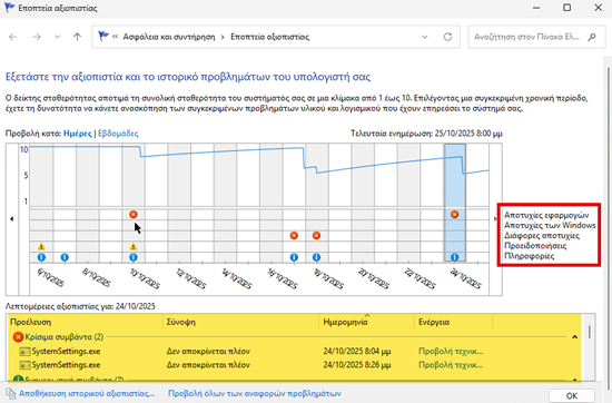 Μέσα από ένα οπτικό χρονοδιάγραμμα, μπορούμε να βλέπουμε σφάλματα, αστοχίες εφαρμογών, ενημερώσεις και άλλες αλλαγές που επηρεάζουν την απόδοση του υπολογιστή μας.