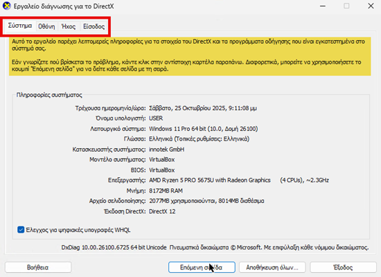 Το Εργαλείο Διάγνωσης για το DirectX (DirectX Diagnostic Tool) είναι και αυτό ένα από τα πιο χρήσιμα Windows tools που παρέχει αναλυτικές πληροφορίες για την κάρτα γραφικών, τα προγράμματα οδήγησης ήχου, την έκδοση του DirectX και άλλα σημαντικά στοιχεία του συστήματος μας.