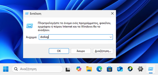 Για να το ανοίξουμε, πατάμε Win + R, πληκτρολογούμε dxdiag και πατάμε Enter.
