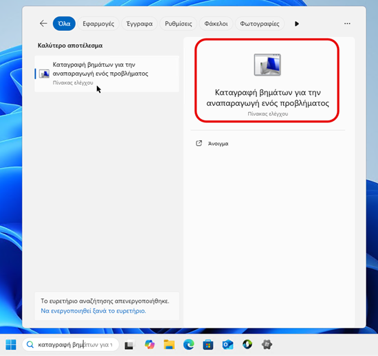 Αρχικά, ανοίγουμε την Καταγραφή βημάτων μέσω της μπάρας αναζήτησης των Windows.