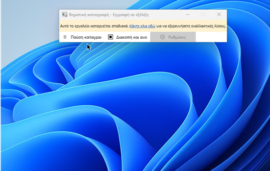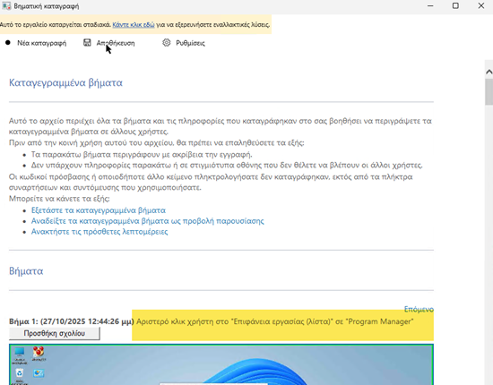 Εάν αντιμετωπίζουμε κάποιο πρόβλημα και δυσκολευόμαστε να το εξηγήσουμε, είτε στις Ερωτήσεις του PCsteps, ή οπουδήποτε αλλού, υπάρχει και η δυνατότητα να το αναπαράγουμε βήμα προς βήμα με την Καταγραφή βημάτων (Step Recorder).