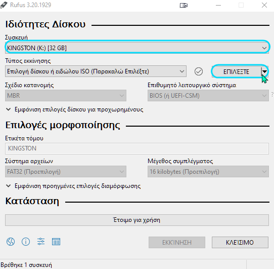 Αν είχαμε ήδη συνδεδεμένο το φλασάκι USB στον υπολογιστή μας, το Rufus θα το εντοπίσει αυτόματα στο πεδίο Συσκευή. Αν πρόκειται για portable σκληρό δίσκο, για να τον δούμε, πρέπει να επιλέξουμε την Εμφάνιση συσκευών USB.