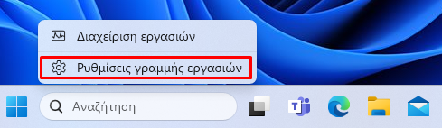 Αρχικά, κάνουμε δεξί κλικ στη Γραμμή Εργασιών και πατάμε “Ρυθμίσεις γραμμής εργασιών”.