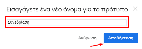 Στο πλαίσιο που θα εμφανιστεί, πληκτρολογούμε το όνομα το οποίο θέλουμε να έχει το συγκεκριμένο πρότυπο και κάνουμε κλικ στην “Αποθήκευση”.