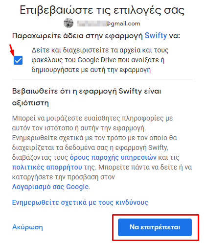 Θα ανοίξει ο browser στη σελίδα επιλογής λογαριασμού Google. Επιλέγουμε στο Drive τον λογαριασμό που θέλουμε να αποθηκεύσει η εφαρμογή.