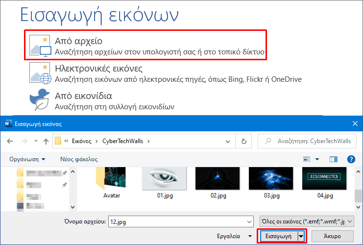 Στο πλαίσιο που θα εμφανιστεί κάνουμε κλικ στο “Από αρχείο”, εντοπίζουμε την εικόνα που θέλουμε να βάλουμε μέσα στο κείμενο, και πατάμε “Εισαγωγή”.