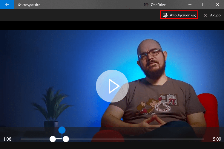 Στο παράθυρο που θα εμφανιστεί, επιλέγουμε πού θέλουμε να αποθηκεύσουμε το κομμένο κομμάτι του βίντεο, γράφουμε το όνομα το οποίο επιθυμούμε να έχει, και πατάμε “Αποθήκευση”.