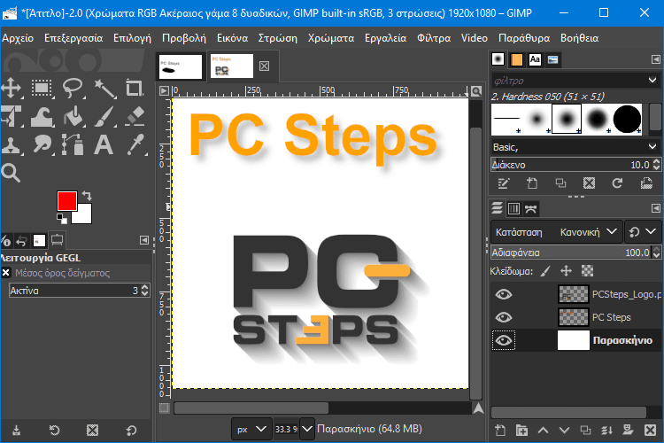 Όσον αφορά το λογότυπο του PCsteps, προσθέσαμε μία μεγάλη σκιά με ανοιχτό γκρι χρώμα, στην τεχνοτροπία επιλέξαμε “Εξασθένηση (σταθερό μήκος)” και στη σύσταση διαλέξαμε τη “Σκιά συν εικόνα”.