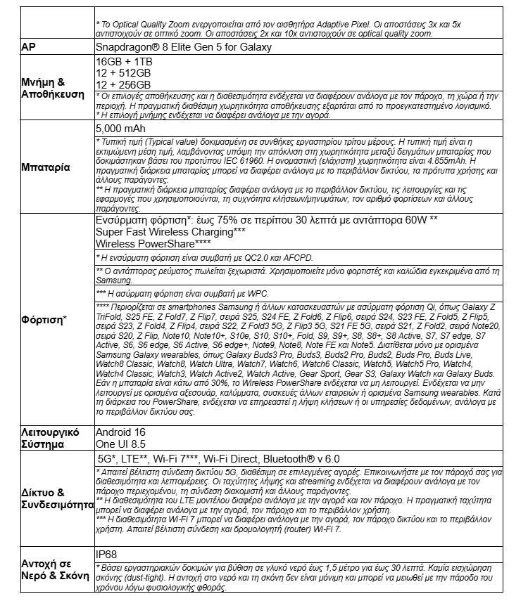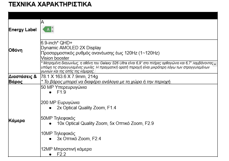 * Ισχύει για προπαραγγελίες των Galaxy S26 512GB, S26+ 512GB, S26 Ultra 512GB στο samsung.com/gr έως 10.3.2026, μέχρι εξαντλήσεως των αποθεμάτων. Κατά την προπαραγγελία, ο καταναλωτής επωφελείται από τον μεγαλύτερο αποθηκευτικό χώρο στην τιμή του μοντέλου με τον αμέσως χαμηλότερο αποθηκευτικό χώρο. Τα παραπάνω μοντέλα διατίθενται για προπαραγγελία στην τιμή που θα διατίθενται για αγορά αμέσως μετά την ημερομηνία κυκλοφορίας (11.3.2026) τα μοντέλα με τον αμέσως χαμηλότερο αποθηκευτικό χώρο, Galaxy S26 256GB, S26+ 256GB, S26 Ultra 256GB αντίστοιχα. Δεν ισχύει για αγορές από το ειδικό ηλεκτρονικό κατάστημα της Samsung για επιχειρήσεις.
