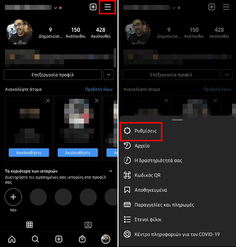 Έπειτα, πατάμε τις τρεις γραμμές πάνω δεξιά και μπαίνουμε στις “Ρυθμίσεις”.