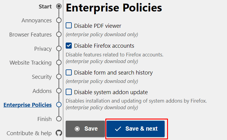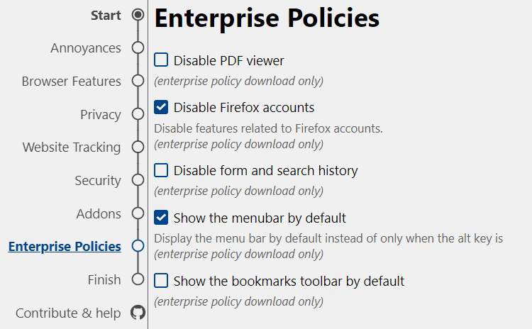 Η τελευταία κατηγορία είναι η “Enterprise Policies” η οποία αφορά κάποια επιπλέον χαρακτηριστικά του προγράμματος περιήγησης της Mozilla, όπως η δυνατότητα προβολής PDF, το ιστορικό αναζήτησης, και άλλα.