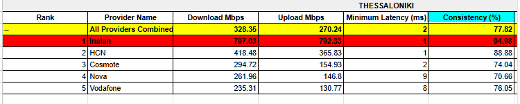 Με βάση τα αποτελέσματα, στην Αθήνα, όλοι οι πάροχοι κινούνται στο 76.71%, ενώ η Inalan εμφανίζει consistency 95.47% και για την Θεσσαλονίκη οι άλλοι πάροχοι έχουν 77.82% consistency, ενώ η Inalan 94.98, σημαντικά υψηλότερο, επιβεβαιώνοντας την αξιοπιστία του ιδιόκτητου δικτύου 100% οπτικών ινών.