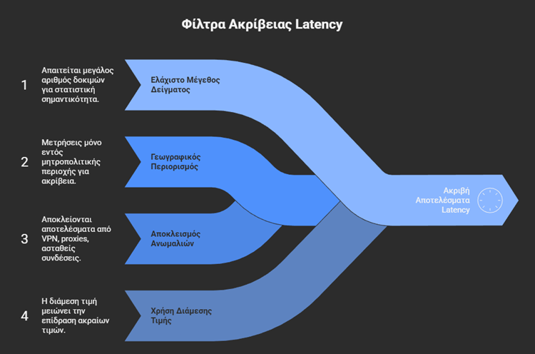 - Αποκλεισμός ανωμαλιών: Αποτελέσματα που που δεν αντικατοπτρίζουν πραγματική χρήση, ή επηρεάζονται από VPN, proxies ή ασταθείς συνδέσεις απορρίπτονται, ώστε να μην αλλοιώνεται η εικόνα της πραγματικής εμπειρίας.