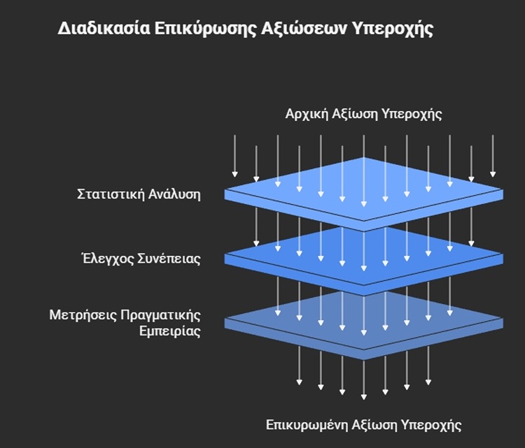 Για να εγκριθεί ένα claim, η Ookla πραγματοποιεί ανεξάρτητη στατιστική ανάλυση, αξιολογώντας τη σημαντικότητα των διαφορών μεταξύ παρόχων και την αξιοπιστία των αποτελεσμάτων. Η διαδικασία περιλαμβάνει ελέγχους υποθέσεων και διαστήματα εμπιστοσύνης, ώστε η υπεροχή να μην μπορεί να αποδοθεί σε τυχαία διακύμανση του δείγματος, αλλά σε πραγματική διαφορά απόδοσης.