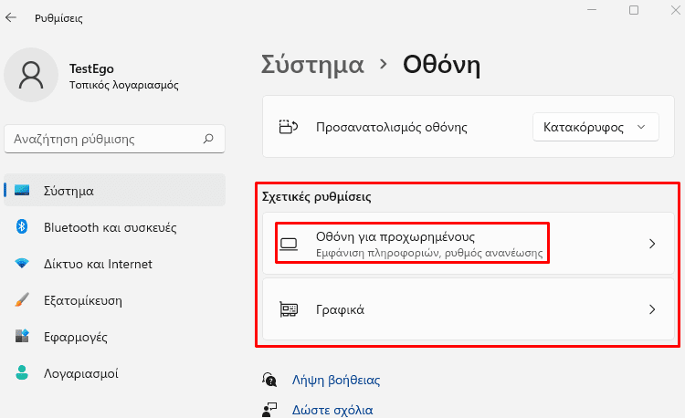 Στη συνέχεια, εντοπίζουμε την ενότητα “Σχετικές ρυθμίσεις” και πατάμε την “Οθόνη για προχωρημένους”.