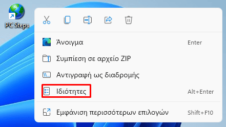 Στη συνέχεια, κάνουμε δεξί κλικ στη συντόμευση την οποία δημιουργήσαμε και επιλέγουμε τις “Ιδιότητες”.