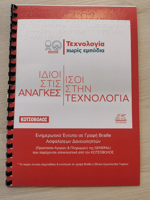 Η Κωτσόβολος, κορυφαίος προορισμός τεχνολογίας, ενώνει τις δυνάμεις της με την ασφαλιστική εταιρεία Generali και παρουσιάζουν τα έντυπα των προγραμμάτων ασφάλισης Προστασίας Αγορών & Πληρωμών και Total Support Insurance σε κώδικα Braille. Για έναν κόσμο καλύτερο για όλους, χωρίς εμπόδια και διακρίσεις.
