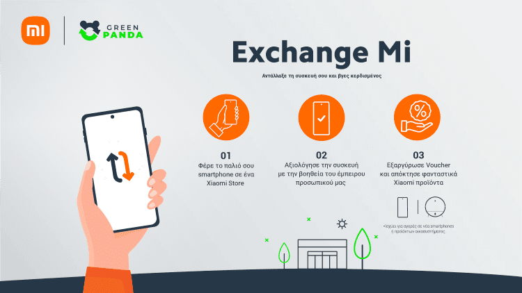 Με την υπηρεσία «Exchange Mi» και τη συνεργασία με την Green Panda, τα Xiaomi Stores καλούν τους καταναλωτές, να συμμετάσχουν και να υποστηρίξουν ένα βιώσιμο μοντέλο κυκλικής οικονομίας, μέσω της επιστροφής και επαναχρησιμοποίησης Smartphones, συμβάλλοντας έμπρακτα στη μείωση της παγκόσμιας ρύπανσης από ηλεκτρονικά απορρίμματα (e-waste).