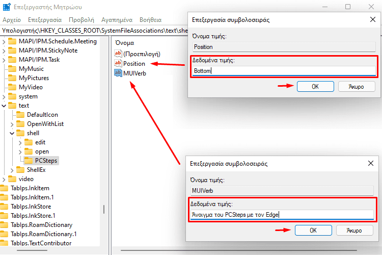 Μετά, κάνουμε διπλό κλικ στο “Position”, στα “Δεδομένα τιμής” πληκτρολογούμε “Bottom”, και πατάμε το “OK”. Ομοίως, αλλάζουμε τα “Δεδομένα τιμής” του “MUIVerb” σε “Άνοιγμα του ΟΝΟΜΑ_ΣΕΛΙΔΑΣ με τον ΟΝΟΜΑ_BROWSER”.