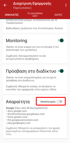 Ενεργοποιώντας τον σχετικό διακόπτη δίπλα από την εκάστοτε μέθοδο παρακολούθησης, το TrackerControl θα μπλοκάρει πλέον αυτή την ενέργεια.
