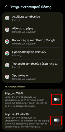 Μετά, απενεργοποιούμε τους διακόπτες δίπλα στο “Σάρωση Wi-Fi” και στο “Σάρωση Bluetooth”.