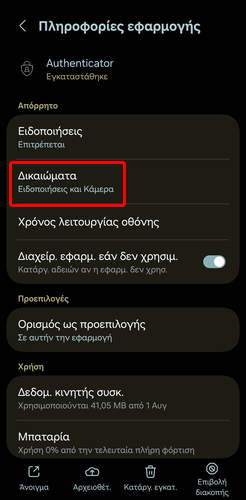 Στη συνέχεια, επιστρέφουμε στις “Πληροφορίες εφαρμογής” και μπαίνουμε στο “Δικαιώματα”.