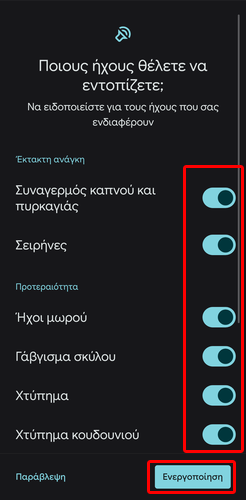 Έπειτα, ενεργοποιούμε τον διακόπτη δίπλα από κάθε ήχο για τον οποίο θέλουμε να λαμβάνουμε ενημέρωση και πατάμε “Ενεργοποίηση”.