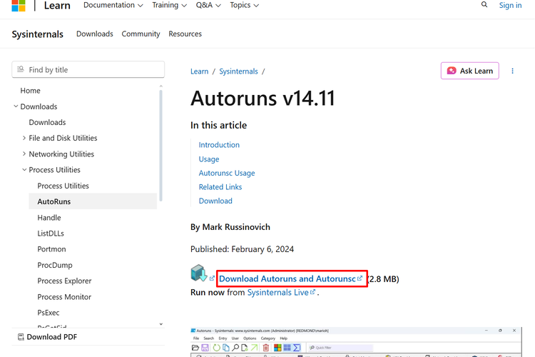 Αρχικά, κατεβάζουμε το Autoruns από την επίσημη σελίδα της Microsoft, πατώντας “Download Autoruns and Autorunsc”.