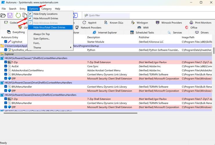 Μετά, ενεργοποιούμε από το μενού “Options” τα φίλτρα “Hide Windows Entries” και “Hide Microsoft Entries”, για να κρύψουμε τα απαραίτητα αρχεία συστήματος και να αποφύγουμε προβλήματα από λάθος παρεμβάσεις.